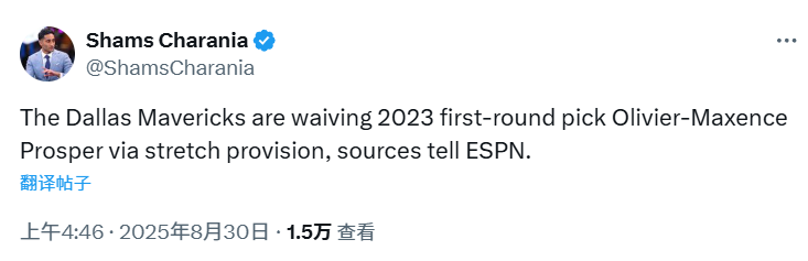 北京时间8月30日,据名记Shams报道,独行侠使用“延伸条款”裁掉普罗斯珀,他的余下薪水(2年820万美元)将分期支付。独行侠裁掉这位2023年NBA选秀大会的首轮第24位新秀,主要目的是为签下但丁-埃克萨姆腾出球队名额,同时帮助球队避免触发第二土豪线。